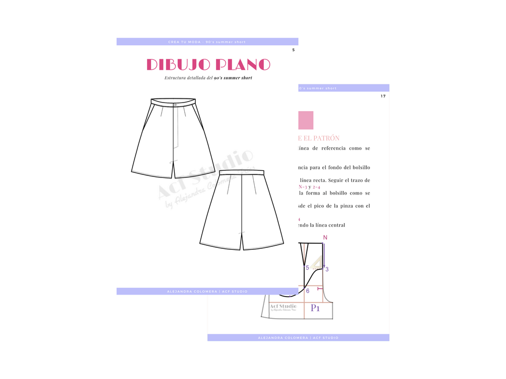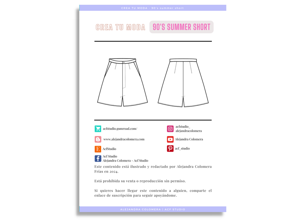 Ebook de “Crea Tu Moda” donde se enseña a realizar el patronaje y la posterior confección del 90’s summer short. Pantalón corto veraniego estilo años 90. Ideal para confeccionar con tejidos ligeros de algodón como popelín, aunque también puedes optar por tejidos más finos y caídos, como la viscosa o crêpe para un acabado con un poco de vuelo.