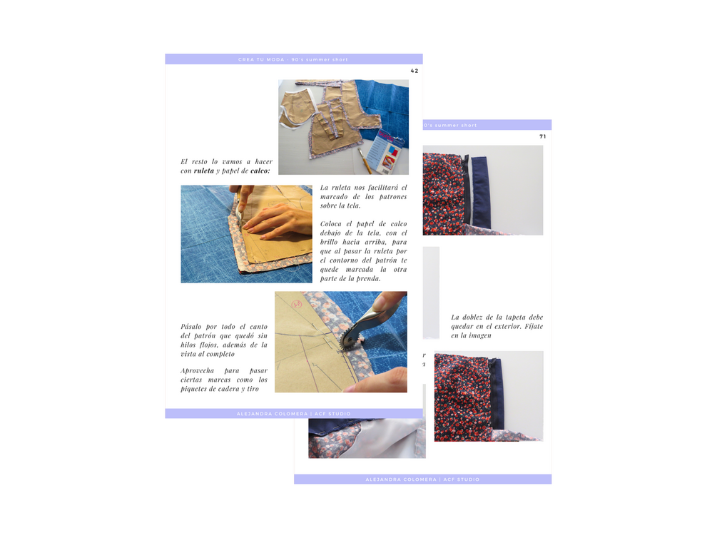 Obtendrás todas la páginas que componen el ebook en formato PDF, donde se desarrolla el proceso de toma de medidas, patrones básicos necesarios, desarrollo de la transformación y proceso de confección. Además, podrás ver procesos de costura en formato vídeo donde hemos creído conveniente.