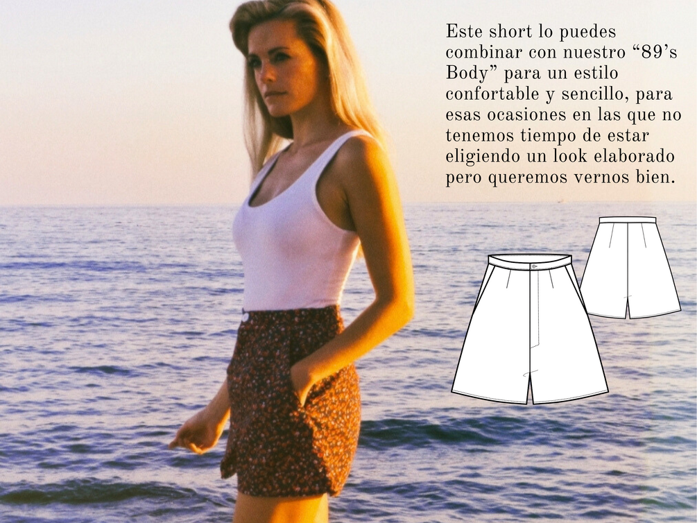 Ebook de “Crea Tu Moda” donde se enseña a realizar el patronaje y la posterior confección del 90’s summer short. Pantalón corto veraniego estilo años 90. Ideal para confeccionar con tejidos ligeros de algodón como popelín, aunque también puedes optar por tejidos más finos y caídos, como la viscosa o crêpe para un acabado con un poco de vuelo.